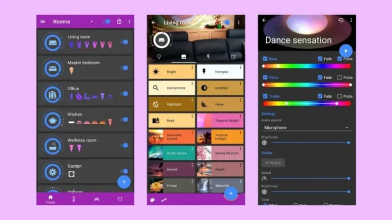 The microphone sensitivity and color range control settings allow you to fine-tune how accurately the bulbs pick up the sound recorded by your phone’s microphone and prevent your lights from bouncing from one end of the spectrum to the other. Even without playing loud music, you can establish the mood for the Hue lamps with a range of strobe patterns and arrays.