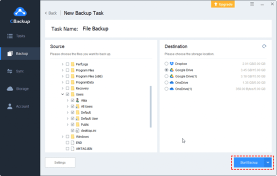 With CBackup, you can create backup tasks for your entire computer, or select certain files and folders from computer to back up.