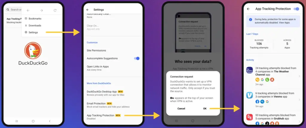 “App Tracking Protection uses a local “VPN connection,” which means that it works its magic right on your smartphone and without sending app data to DuckDuckGo or other remote servers,” explains DuckDuckGo.
