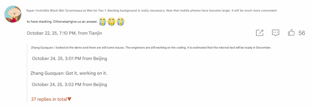 A Xiaomi devotee responded in a Weibo debate by calling for the inclusion of a stacked background interface, particularly given the larger screens of modern smartphones that necessitate more fluid multitasking capabilities. Zhang Guoquan replied, “Received, working on it,” to the comment. He then added that the functionality is currently in the demonstration stage but still undergoing optimization. The code is now being finished by programmers, and internal testing is expected to start in December.